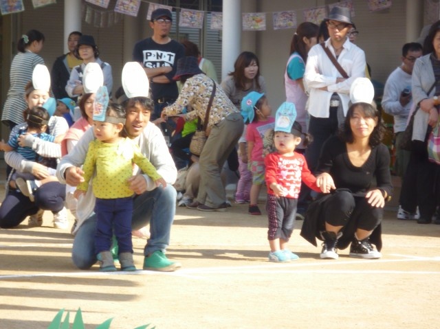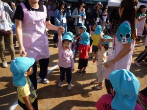 いよいよプログラム1番全員で体操です。みんなの元気な声が空まで届きそうです。2才児も一緒にやっています。