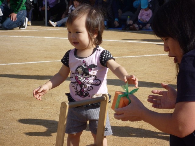 0歳児の親子競技です。プレゼントを乗せた手押し車でスタート。青木先生にプレゼントを渡すとメダルがもらえます。お父さんに軽々抱っこされ、ニコニコです。