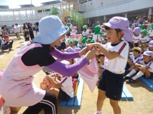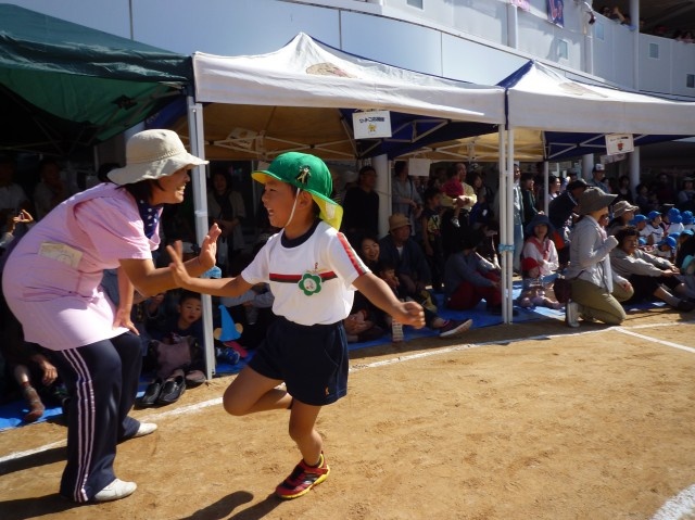 年少のかけっこです。ももたろうに変身し、岩をピョンピョン! 怖~い鬼をタッチしてやっつけ、担任の先生の所まで走っていきます。ムギューとしてもらい最高の笑顔!