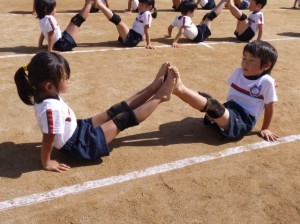 年長児の組体操です。個人の技から、2人組、3人組、7人組、そして全員で人間ドミノ。最後はクラスごとのポーズがきまっています。約4分間の演技に会場全体から拍手が湧き起こりました。さすが年長さん(^O^)