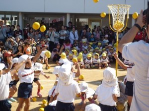 年中クラス対抗の玉入れです。いるかの青玉、こあらの赤玉、ぱんだの黄玉、サアーどのクラスがいっぱい入ったでしょうか?