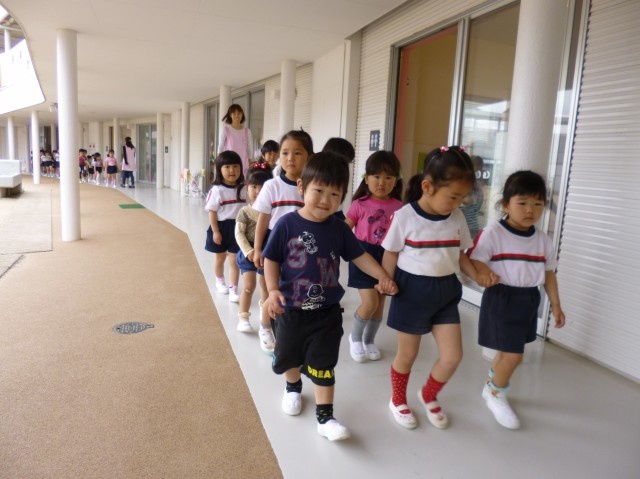 ・初めての集会なのでホールまで年長児が年少児を連れていってくれました。頼りになるお兄さんお姉さんです。年少児も嬉しそう!!