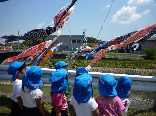 園の近くの川に4月になると地区の老人会の方々がこいのぼりをたくさん飾ってくれます。