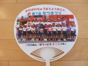 子ども達が持っている手作りうちわの片面はクラスの集合写真、片面は子どもの製作したものが貼ってあります。