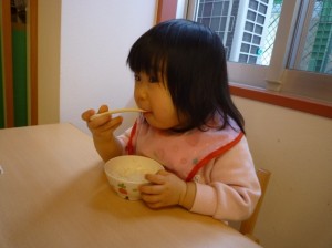公園まで歩いたり遊んだのでお腹はペコペコ!自分で食べる子が増えてきました。
