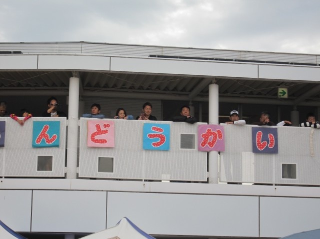 サァーそれぞれクラスのテントに集合です。うしろには父母がいっぱい。