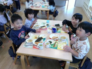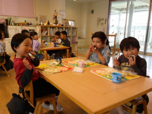 しょうゆとのりをつけ、いそべ餅に。「おいしい!」「やわらかーい!」「もっと食べた~い!」と言って食べていた子どもたちでした。2個のおもちをペロリと完食していました。