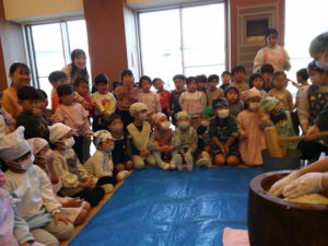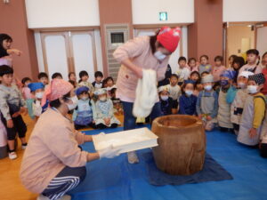 だんだんとお米からおもちに変身していくと「うわ~」と歓声が!小さい組さんも応援してくれ、完成!