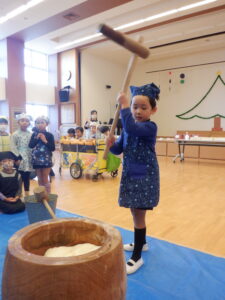 「よいしょー!」の掛け声に合わせて重いきねを頑張って振り上げ、お父さんたちにもお手伝いをしてもらいながら、おもちをついていきました。