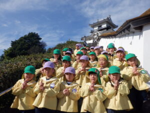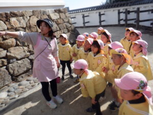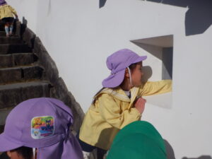 石垣、長い階段、いろいろな形の穴など、お城ならではの造りに驚いたり、「なんでだろう?」と考えたりする姿が見られました。色々知れて面白いね!!