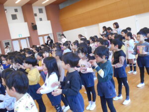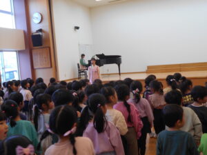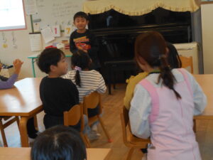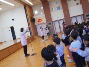 ホールでの始業式は、園長先生の話を聞いた後、♪園歌を歌い、♪コンコンクシャンの手遊びをしました。