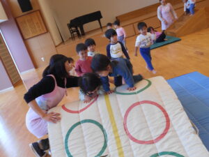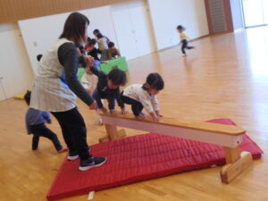 始業式後、1歳児・2歳児・満3歳児は、ホールで身体を動かして遊びました(^^)/