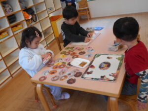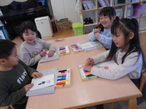 幼児組は、部屋であそんだり、冬休み中の楽しかったことをみんなに伝えたり、新しいグループのマークや当番表を作っていました。