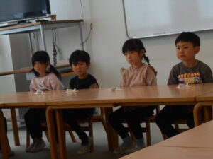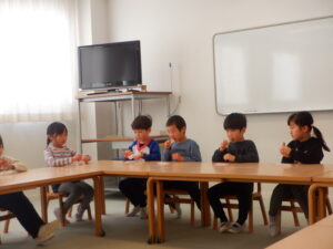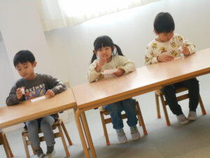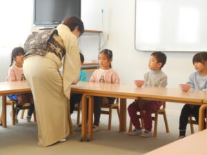 年長 新春 お茶会を行いました。着物を着たお茶の先生(志村先生とそのお弟子さん達)が来園し、会議室で子どもたちをお出迎えしてくれました。いつもとは違う雰囲気に緊張している様子の子どもたちです。