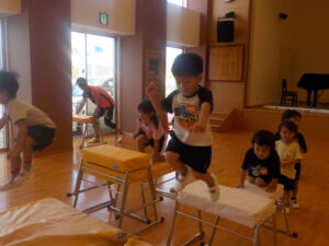 跳び箱の前段階にもトライ!高いところから飛ぶ感覚を身につけます。まるで、オリンピックのジャンプラージヒルばりの写真です💦