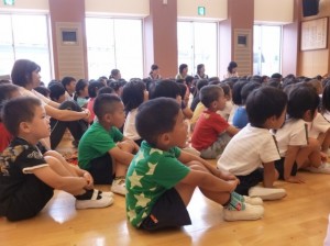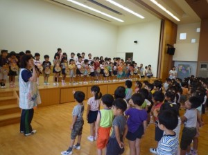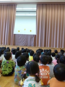 先生たちのペープサートの後は、みんなで「たなばたまつりのうた」を歌います。みんなの歌声がおりひめさまとひこばしさまに届くといいですね。